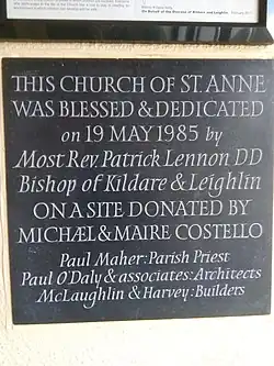 The current church was built in 1985 on land donated by Michael and Máire Costello. It was dedicated in 1985 by Patrick Lennon, Catholic Bishop of Kildare and Leighlin.[9]