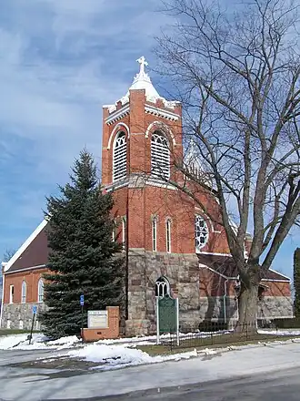 In 1843, Kelly purchased two acres near this site for a church and cemetery. A frame church was constructed in 1846. In 1857, the parish purchased two acres of adjacent land and built a rectory. About 1870 the church changed its name to the current St. Augustine. In the early 1890s, Father George J. Maurer oversaw the construction of the present church, which was completed in 1895. He hired architect Harry J. Rill of Detroit to design the building. After completion of the new church, the old frame structure was demolished.[2] In 2018, the church congregation celebrated its 175th anniversary, and is still using the 1895 building.[3]