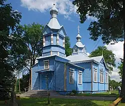 St. Barbara's Church in Milejczyce is a wooden structure, set on a stone foundation, oriented, and built using a log construction technique reinforced with formwork. Before the renovation between 2013 and 2014, the exterior was painted with oil paint. The building follows a tripartite layout. It features a square nave, and lower square-plan structures for the chancel and church porch.[1] Above the church porch rises an octagonal tower topped with a pyramidal tented roof and an onion dome. The nave is surmounted by a tholobate crowned with an octagonal roof lantern with a pyramidal tented roof and an onion dome. The church's roofs are made of sheet metal. The nave is covered by a tented roof, the church roof by a gable roof, and the chancel by a similar gable roof. The church windows are rectangular.[1]