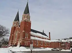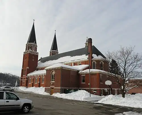 The cornerstone of the present St. Bernard's Church was laid during a ceremony five months after the fire. Shortly thereafter the chapel in the basement was dedicated and used for Mass and other services until the upper church was completed. The new church was dedicated on September 20, 1908.[1]