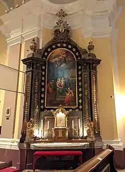 The first side altar is the Altar of the Holy Family on the epistle side of the chancel, opposite the pulpit. It was built after the Great Tabán Fire around 1815 in a similar Late Baroque style to the main altar and all the other important items of church furniture. The pediment is decorated with two flaming vases, the Eye of Providence and two putti holding a cross. This is the altar where the eucharist has been kept in a Neo-rococo tabernacle since the predella of the main altar was removed. Four candlesticks and two statues of angels in adoration are displayed on the ledge. The altarpiece is set in a concave frame decorated with gilded rosettes. The original painting was destroyed in the bombardment of 1849. The present altarpiece was painted by Jakab Marastoni in 1850 in a similar Italianate style as the painting on the main altar. It depicts a sacra conversazione between the Holy Family and John the Baptist, Elizabeth and Zechariah with angels and putti in the sky.