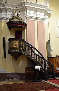 The reconstruction was begun by József Dankó the Elder in 1812 and it was finished by Ludwick Kimnach in 1818.[10] Due to a shortage of funds, the ornate spire of the tower was replaced with a symple pyramidal roof in 1823. The interior and the new furniture was not finished until the 1830s. A new parish house was also built in 1818-19.