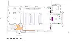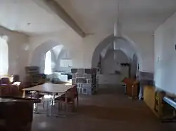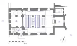 The interior of the church is divided into a western and an eastern section. The entrance is through a small hall with a painted ogival vault in the south of the western part of the building.[27] From there, a door leads to the west to the south tower and the staircase to the upper floors, to the north to the community room, and to the east to the actual interior of the church, which is three steps higher.[47]