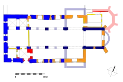 The clear protrusion of the side aisle foundation on the inside leads to the assumption that the side aisles were widened slightly in the second half of the 12th century. Based on the walled-up arched windows and the interior paintings, it can be determined that they were three-quarters as high as they are today.[24] The new walls of the side aisles were constructed with greater thickness. Their thickness, similar to that of the west transept, is approximately 1.30 meters, while the older walls are only approximately 90 centimeters thick.[16] Ulfrid Müller also postulates that the central nave was significantly elevated during this construction phase,[25] yet this theory is contested by others.[24] The separated crossing remained unaltered during the late Romanesque construction phase.[16]