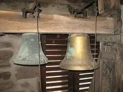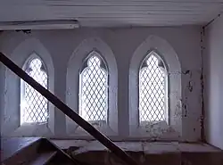 The upper floor above the chancel is open to the interior of the church as a gallery. The organ is located in the central nave, the northern part of which is accessible from the central gallery through an arched doorway. South of the gallery, next to the tower, is the former Maurice Chapel with three lancet windows placed side by side. Up to the level of the window sill, the outer wall of the room is considerably thicker than above. The resulting wall ledge, 58 centimeters deep, is covered with sandstone slabs and still has a piscina on the right side. In the northeastern corner of the Maurice Chapel, a wall pillar, which runs vertically across the entire height of the room in the entrance hall and is decorated with mural paintings, breaks off irregularly above the floor. The interlocking with the walls indicates that it once supported the altar, the top of which was one meter above the floor.[47] The Maurice Chapel contains the weathered central columns of the vaulted sound openings of the towers, which had to be replaced with new ones. There are also two keystones from a ribbed vault, dated 1522 by their inscription.[32] The Maurice Chapel forms the passage to the gallery and contains a wooden staircase as an access to the south tower, the shaft of which is empty. In the north tower, a ladder leads to the belfry.[47]