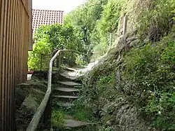 Access to the church from the village was only possible on foot via three steps carved into the rock until the early 19th century. The road leading from the village to the church hill was built during this time. The steps are now very worn out.[3] Carts could only access the church from the north-east via State ownership.[4]