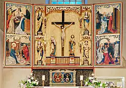 The winged altar, which has served as the main altar since the end of the 19th century, is composed of a central shrine with carved figures against a golden background and two hinged wings painted on both sides. Both the paintings on the wing panels and the lines of text on the front and back indicate that it was originally a Marian altar.[60] During a restoration in 1885-1887, it was redesigned as a crucifixion altarpiece.[61] The inscription on the altar wings indicates that the altar was consecrated in 1498. The altar was consecrated by Johannes, the titular bishop of Sidon and vicar general of Archbishop Berthold of Mainz.[62] There is no written record of the donor or donors of the altar.[63] The newly consecrated panel with carved and painted images of the Virgin Mary is mentioned in a certificate of indulgence from 1499.[60]