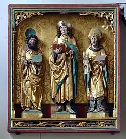 Three figures - all holding a book - depict St. Judoc[78][66] as a pilgrim with a scallop shell on his head in the center, St. Bartholomew on the left, and Saint Blaise on the right. The central figure of Judoc is a good head taller than the flanking saints. They all stand on pedestals with inscriptions and have halos behind their heads on a gold background with the inscriptions: "SANCTVS.BARTHoLOMEVS.", "SANCTVS.JODOCVS." and "SACTVS.BLASIVS." (sic!). The pedestal inscriptions read "SANCTVS.BARTOLOMEVS" on the left and "SANCTVS.BLASIVS.EPISC" on the right,[79] although below the central figure is the year ".DVSENT.VNDE.VIF.HVNDERT.SEFVEN.". (1507).[80] The figure of Judoc also has inscriptions on the hem of his robe, interrupted by creases and folds in the hem of the robe: "CRISTVS" on the right arm holding the book, "MARIE" under that hand, "IHESVS" on the right collar (facing left from the viewer's perspective), "M" on the left collar, "SANCTVS" on the lower hem of the robe, "(...)OCVS" and "FA" after a folded section of the hem, and "MANG" at the bottom right.[81] All the inscriptions on the Judoc shrine are in early humanist capitals.[79] The inscriptions for the figures mentioned by Hector Wilhelm Heinrich Mithoff as "S.JACOB.MAJ" in the center, "SCS.BLASIVS" on the right, and "S.BARTHOLOMEVS" on the left no longer exist in this form;[40] Tobias Ulbrich thinks it possible that the inscription for James is on the invisible back of the base of the center figure.[64]
