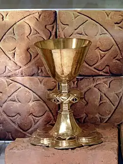 In the eastern wall of the choir, there are also the remains of a Gothic stone sculpture with a central pinnacle that has a crown carried by two angels instead of a finial.[40] Its original function is interpreted as the crowning of a sacramental niche.[64][89] It is said to be a much cruder copy of a sacrament niche from St. John's Church in Göttingen.[61]