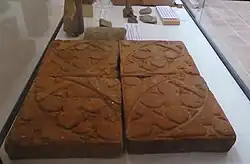 According to recent findings, the passage from the northern bay of the church to the southwestern corner of the adjacent cloister was walled up from the inside already in the Middle Ages. On the outside, a niche was created, the lower part of which was later also walled up. Four Gothic tracery tiles were found under a layer of humus during drainage works in 1993. Neither in the adjacent area of the cloister nor in the area of the door threshold under the medieval wall was there any continuation of the tiling or any evidence of it.[35] Hildegard Krösche thinks that these tiles belong to the chapel north of the choir.[36]