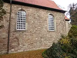 During the same construction period, a chapel of Saint Maurice with three Gothic lancet windows was built above the entrance on the south side of the church.[27] The chapel of St. Maurice extended over two bays and the wall of the side aisle was raised for the chapel at this point.[28]Access was through the gallery. Due to the size of the chapel room, the east wall was not on the axis of the existing pillar, but one meter east of it. The wall on the first floor was supported by a wall directly below it, creating a separate entrance hall under the chapel. The altar of St. Maurice's Chapel had its brick foundation, visible as a column in the northeastern corner of the vaulted entrance hall.[26] The altar, and thus the chapel, was first documented in 1415 on the occasion of the establishment of a mass for the souls.[29] According to the Göttingen chronicler Franciscus Lubecus, another chapel was built by Abbot Gunter von Roringen before he died in 1300 as a burial place for the abbots of Reinhausen monastery. This dating is questionable because Gunter was still abbot of the monastery in 1382 and 1385.[30]
