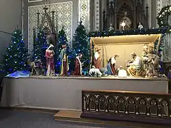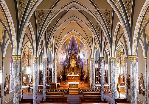 In 1892 the present rectory was built as a Franciscan monastery with 30 rooms plus a spacious attic. The previous rectory was located directly to the east of the church and needed to be moved to make way for an expansion of the church building. The parish then numbered about 100 families, fairly evenly divided between farmers, railroad people, and other business people. In 1894 the church was expanded, adding an apse and two transepts containing large stained-glass windows made by George A. Misch and Brothers of Chicago. The south window depicts the three patrons of the Franciscan order: Saint Clare of Assisi, St. Louis IX, King of France, and Saint Elizabeth.[3] The north window shows the Holy Family of Jesus, Mary, and Joseph. The four stained-glass windows in the apse depict Saint Francis receiving the stigmata, the Annunciation, the child Jesus appearing to Saint Anthony, and St. Margaret Mary Alacoque receiving the devotion to the Sacred Heart. Much of the statuary dates back to the late 19th century and was manufactured in Munich, Germany.[4]: 55