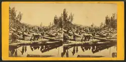 The lumber industry continued to grow throughout the latter half of the 19th century, with progressively larger spring drives and consequent dangers to navigation on the river above Stillwater. Logs were frequently caught in log jams at the narrow Dalles of the St. Croix River, and in 1883 the blockade was so severe it took almost two months before the flow of logs was re-established.[12]: 76 The 1886 jam, described as the "jammedest jam", required the use of steamboats and dynamite to clear. At its peak in 1890, logging in the St. Croix River valley produced 450,000,000 board feet (1,100,000 m3) of lumber and logs.[19] The lumber industry continued until the last major log drive in 1912 marked the end of the rich white pine forests of the area.