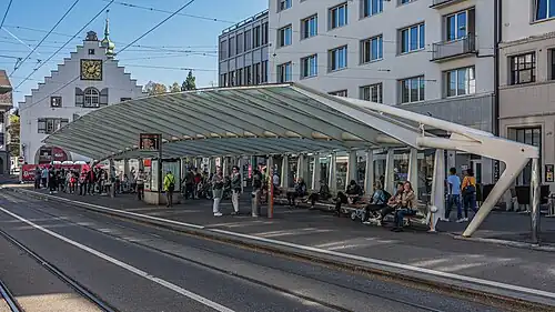 St. Gallen Marktplatz station, also called Marktplatz/Bohl, is a railway station in the city of St. Gallen, in the canton of St. Gallen, Switzerland. It is located on the 1,000 mm (3 ft 3+3⁄8 in) Appenzell–St. Gallen–Trogen line of Appenzell Railways (Appenzeller Bahnen, AB), and is served by local light rail trains only.[5][6] The station is also a bus stop for local and regional buses.