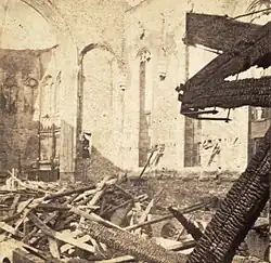 The church was gutted by fire in 1865,[9][11] and was rebuilt within the next two years[9] under the supervision of Eidlitz.[2][6] The pastor of St. George's at the time of the reconstruction was Stephen H. Tyng, who was a leader in the evangelical wing of the Episcopal Church, and considered to be one of the most notable preachers of the time.[6] Under his instructions, the interior of the rebuilt church reflected his views: the altar, for instance, was a plain table.[9]