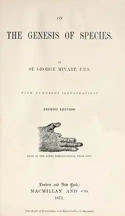 Even before Mivart's publication of On the Genesis of Species in 1871, he had published his new ideas in various periodicals.[7] Huxley,[8] Ray Lankester, and William Henry Flower had come out against his ideas, although O'Leary (2007) reports that "their initial reaction to Genesis of Species was tolerant and impersonal".[9]