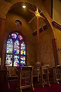 The inside of the present church is decorated with modern stained glass which can be seen behind the altar, at the back of the church, and adorning the doors.