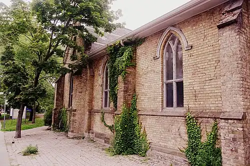 The cornerstone of the church was laid on Monday, August 19, 1844 by Bishop John Strachan[4] and the church opened as St. George the Martyr Anglican Church on November 9, 1845. The original church was located at 205 John Street, on land donated by the Boulton family (who lived in The Grange). It was the third Anglican parish in the city, after St. James Cathedral and Little Trinity. The Gothic Revival style church with 150-foot spire was designed by Henry Bowyer Lane and the bricks were built from clay from Ramsden Park.[3] The parish hall (now the church's place of worship) was constructed in 1857 by Kivas Tully and the rectory (now artist studios) was constructed in 1865 by Gundry & Langley.[5][6]