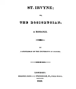 St. Irvyne; or, The Rosicrucian: A Romance is a Gothic horror novel written by Percy Bysshe Shelley in 1810 and published by John Joseph Stockdale in December of that year, dated 1811, in London anonymously as "by a Gentleman of the University of Oxford" while the author was an undergraduate.[1][2] The main character is Wolfstein, a solitary wanderer, who encounters Ginotti, an alchemist of the Rosicrucian or Rose Cross Order who seeks to impart the secret of immortality. The book was reprinted in 1822 by Stockdale and in 1840 in The Romancist and the Novelist's Library: The Best Works of the Best Authors, Vol. III, edited by William Hazlitt. The novella was a follow-up to Shelley's first prose work, Zastrozzi, published earlier in 1810. St. Irvyne was republished in 1986 by Oxford University Press as part of the World's Classics series along with Zastrozzi and in 2002 by Broadview Press.