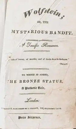- ^ Wolfstein, the Murderer; Or, The Secrets of a Robber's Cave: A Terrific Romance. To which is Added, The Two Serpents, an Oriental Apologue.