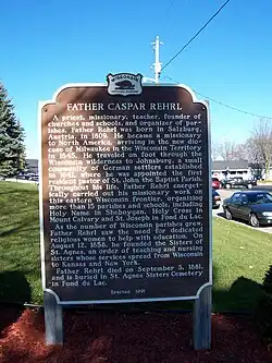 Immigrants from Prussia began settling in the Holyland region of Wisconsin in the 1830s. They began holding religious services in settler's huts with services conducted by Father Theodore Van den Broek.[2] Members donated 2 acres of land for a permanent site and a small log church was built over the middle of 1843.[3] Father Pete Carabin was appointed the first permanent pastor but he did not take residence.[3] The Archdiocese of Milwaukee was formed in 1843; the church has remained in the archdiocese since.[4] Newly appointed Bishop John Henni, a Swiss native, visited the church and parishioners were excited to be addressed using their native German language.[4] An 1844 census of the church showed 40 registered families.[3] The Bishop named Father Caspar Rehrl the first resident pastor in September 1845.[5] All land within 8 miles (13 km) from Lake Winnebago had been purchased by settlers or was owned by Native Americans and parishioners built a church on the large hill in Mount Calvary which is now the home of the St. Lawrence Seminary High School.[6] Father Fabian Bermadinger arrived from Austria (along with three Brothers) to assist Rehrl in 1847.[7]