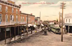 An extension to the City & Suburban Rail Company's line in North Albina to St. Johns was announced. The company built double tracks of steam trains that would stop at Ockley Green Station where electric cars would take over to Albina and eventually Portland.[33] Set to begin in July 1903, the St. Johns Railroad Company announced that they would construct an electric streetcar line from St. Johns to North Albina.[34] A year before, Portland's City & Suburban Rail Company electrified their passenger lines to St. Johns.[35] Before that, the town was somewhat isolated from Portland. The steam passenger cars were available, but the route was roundabout and proved inefficient. After the installation of the streetcar, travel time to the rural town was slashed and the population and number of industries steadily increased over the next years.
