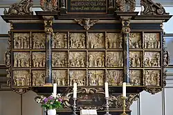 Most pieces date back to the time between the burning and the new church, including an altar from the workshop of Hein Baxmann, a wood carver from Hamburg who created 24 biblical scenes, and the chancel, which was until 1962 in the centre of a rood screen.[1]