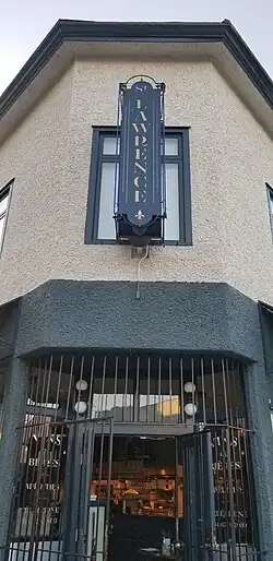 The building at 269 Powell St. was built in 1905 and originally housed the Komura Bros. General Store, an anchor store for Vancouver's Japanese community.[14] In 1942, the family was forced out of the building when the Canadian government remanded Japanese-Canadians to internment camps following the Canadian declaration of war on Japan at the start of World War II.[15][16] The exterior of St. Lawrence retains the original tiling outside the front door, including the word "Komura".[4] The metal gates surrounding the door are also original.[12] The door and exterior walls are painted a deep blue-green, and a large cream-and-black sign with the restaurant's name hangs above the door on the building's second floor.[17][12]