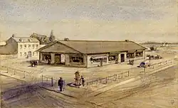 The first St. Lawrence market building, a temporary shelter, 24 feet (7.3 m) by 36 feet (11 m) was built in 1814.[6] The first permanent structure was built in 1820. In 1823, the town's first public well was dug on the property.[6] In 1831, the wooden market building was torn down and a quadrangular brick building with arched entrances at the sides was built. The building's office space served as a temporary home to City Council until 1845.[9] This building was used until the 1849 Toronto Great Fire destroyed the northern side of the building and it was torn down.