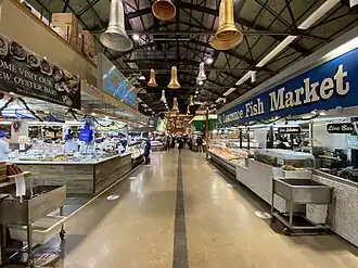 St. Lawrence Market was first established in the early 19th century, originating from a proclamation that established a designated area near King Street and New Street (later renamed Jarvis Street) for a public market in 1803. The first buildings erected for the market emerged in 1814, with the first permanent structures built in 1820. The first permanent market building was later replaced in 1831 with the first St. Lawrence Market North building. The market also served as one of four post offices in York prior to 1834.[1] The market venue was damaged after the Great Fire of Toronto of 1849, and was architecturally replaced in 1851. The market was expanded in the early 1900s, with portions of a former Toronto city hall being integrated into the ground broken facility, opened as St. Lawrence Market South in 1902, and a counterpart north wing was constructed in 1904, later architecturally replaced in 1968, and again in 2016.
