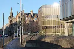 Prominent modernist buildings include the former Scottish Widows headquarters on Dalkeith Road, constructed to a polygonal, glass-fronted design by Basil Spence, Golver & Ferguson and opened in 1976. Sylvia Crowe served as landscape consultant.[97] Slightly to the south on Dalkeith Road stands the Royal Commonwealth Pool, another modernist building, designed in 1967 by John Richards of Robert Matthew, Johnson-Marshall & Partners. The exterior is over three levels with long facias.[58] Other public buildings include the Scottish Renaissance-style former James Clark Technical School by J. A. Carfrae (1913) at St Leonard's Crag and the post-modernist St Leonard's Police Station by Lothian Region Architects (1989).[1][96]