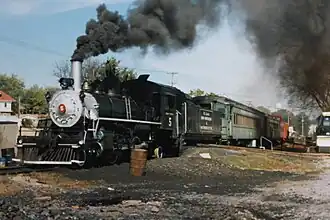 In 1971, #5 was acquired by the newly-established Crab Orchard and Egyptian Railway and moved to their location in Marion, Illinois.[1] It was subsequently used for tourist trips on former Illinois Central Railroad trackage.[6] During the winter of 1973 and 1974, crews converted #5 from a tank engine to a tender engine, removing the saddle tank and converting Illinois Central auxiliary water tender X5512 (formerly numbered A-512) to a conventional tender with a coal bunker.[7][2] On October 18, 1977, #5 pulled the CO&E's first revenue freight train and with the subsequent profit from revenue freight runs and declining success of tourist trips, the CO&E discontinued all passenger trains in 1979.[1] #5 was withdrawn the same year.[7]