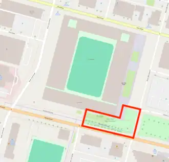In 2020, after St. Louis had been awarded a Major League Soccer team and the stadium site was selected, the master plan was amended to include the stadium as the Mall's terminus.[46] The stadium provides a western bookend for the Mall while framing the Civil Courts Building and the Gateway Arch.[46][48] The Aloe Plaza West Extension was incorporated into the stadium's public plazas and the Brickline Greenway along Market.[48]