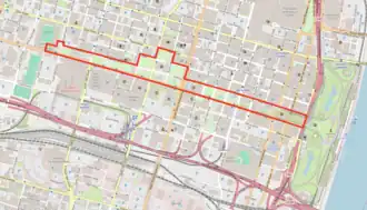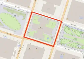 This block originally opened in 1976 and is dominated by Richard Serra's Twain sculpture which itself was dedicated in 1981.[27] It was designed specifically for the location and is intended to give viewers insights and perspectives as they walk around it.[28] The park was built with no paths as Serra didn't want to direct from the start how people walk into and around his sculpture.[29] The sculpture was controversial from its opening with some describing it as "big iron sheets."[30] Initially, the block was to be landscaped, lit, and had benches installed. Instead, within a few years and lack of maintenance funding, much of the landscaping had died and the lights and benches had succumbed to vandalism.[30]