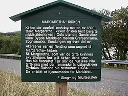 The church was built in the 13th century, and is now a ruin. The church is named after Margaret of Antioch. It was located in Maridalen, close to the northern end of lake Maridalsvannet. Architect and archaeologist Gerhard Fischer led the restoration in 1934. Today it is the best preserved medieval building in Oslo next to the Old Aker Church.[3][4][5][6]