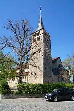 The present church was conceived around 1059 to serve as the church of a Benedictine monastery, founded by Adalbert II., Count of Calw. The church was built on the foundations of an earlier church, in Romanesque style as a basilica with a flat wooden ceiling.[1] Construction began in 1080, and the church was consecrated on 4 July 1083 by the Bishop of Würzburg and the Archbishop of Salzburg, dedicated to Martin of Tours.[3] Building was completed in 1132 under Welf VI of Spoleto.[1][4] The church also served the local parish.[5] The Sindelfingen Abbey was dissolved in 1447.[5]