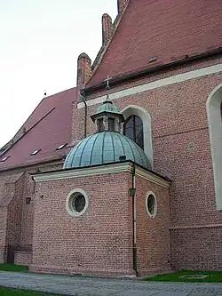 At the end of the 15th century, roofs were elevated, using pine wood, brought via the Brda river and chopped on the spot, the gable and the presbytery roofs were star-shaped and vaulted. At the same time, the church's southern steeple was attached to the main body.[3]