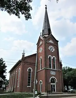 The four buildings that form the parish complex sit across the street from each other and visually form a unified complex.[8] Their exteriors are all composed of dark red brick, although the convent has subsequently been covered in vinyl siding. The church was built in the Romanesque Revival style, with a rectangular plan, decorative brickwork and a central bell tower that rises 135 feet (41 m).[1][3] The exterior features corbelling and brick pilasters on the sides that frame the tall narrow windows, which are capped by plain round-arched hoods. There is a concentration of ornamentation on the upper portion of the tower. It includes gablets with cross finials, round-arched louvers in the bell-chamber and small oculi that are placed halfway up the spire.[8]