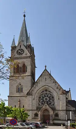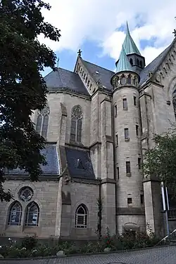 The Catholic community in Homburg grew strongly during this time. In 1866, 1,350 of Homburg's 7,400 residents professed the Catholic faith. In 1869, Bishop Ketteler made Homburg its own parish. The growing community resulted in the desire for a larger church. In 1863 a building site was acquired. These were the properties at Dorotheenstrasse 15 and 17. However, due to the Kulturkampf, construction could only begin 20 years later under the Mainz Cathedral builder, Ludwig Becker. He used the plans he originally created for St. Josef in Krefeld. In 1892 the foundation stone was laid. The inauguration took place in the presence of Queen Victoria of Great Britain on August 14, 1895. In 1915, the Marienkirche became the seat of the newly founded deanery of Homburg vor der Höhe.[3]