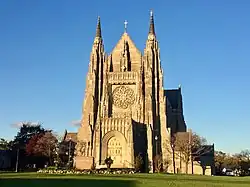 The main building is a Gothic Revival structure, designed by Boston architects O'Connell & Shaw and completed in 1928. It is an elegant example of French Gothic architecture, notable for the large rose window in the front-facing gable end.[2][3]