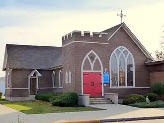 The main block of the church, a gabled, wood-frame structure, was moved to its current location, on the southwest corner of First Street and Wardwell Avenue, in 1928.[2]