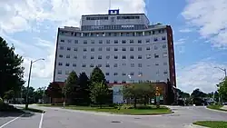 In 1952, the chronic overcrowding and lack of space was noted as an issue, particularly in the obstetrics department.[15] In 1953, new federal grants brought funds to ameliorate this issue and the paediatrics department was expanded.[16] 1954 was a busy year for the Hospital, it was granted accreditation by the Joint Commission on Hospital Accreditation and a committee was formed to discuss financing a major expansion. At this time, the X-Ray Department was expanded and upgraded substantially and was promoted as the most advanced in Canada which more than doubled patient capacity.[17] The major expansion of the Hospital was to limit the beds to a 150 bed increase. "Scheme D" was chosen as the preferred option by the Sisters of the Hospital administration which would build a new seven floor vertical structure north of the Hospital connected via tunnel owing to lack of space around the original building. The final plans called for a nine storey building and 150 beds to be built.[18] Such an expansion required sufficient funds which were to be granted from the federal and provincial governments with the Hospital needing to raise funds as well. To this end, General was added to the name in 1959 to combat the perception that the Hospital was only for Roman Catholics. The fundraising campaign began 31 October 1959 intending to raise 1.1 million dollars.[19] The expansion between 1959 and 1962 saw the hospital grow from 123 beds to 354. The expansion of the hospital in 1960 added a new 10-storey tower where most of the existing hospital was replaced with the new expansion. The remaining part of the building now houses the administrative offices. This part of the building used to be the nurses’ residence.[20] The expanded facility included an emergency department and an intensive care unit.