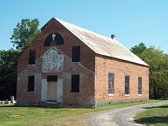 St. Mary's Catholic Church, Newport is a historic parish located in Newport, Charles County, Maryland, established in 1674. Several churches have been built on the property over its history. At present there are two churches remaining, one built in 1840, deconsecrated in 1906 and no longer used for religious services, and the current church building, built in 1954. The historic 1840 church is a rectangular brick structure, four bays in length and three bays wide. It is of simple architectural styling typical of the Greek Revival period in this locality. Located on the property is the parish cemetery, which includes the burial plot of the Brent-Merrick family, including congressman William Duhurst Merrick (1793–1857). It has several impressively scaled and ornamented monuments enclosed within a decorative mid-19th century wrought iron fence. Other memorial stones bear the signature of "A. Geddess," who founded the long-active Geddess monument firm of Baltimore in 1822.[2]