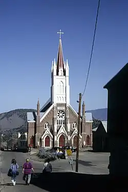 The area experienced a massive influx of Irish immigrants during this period to work the mines.[5] This necessitated the construction of a larger brick structure across the street, which O'Connell dedicated on November 20, 1870. This church burned in the Great Fire of 1875, but was rebuilt the following year.[6]