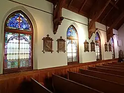 Built along a modified cruciform ecclesiastical Gothic plan, the sandstone church rests on an un-coursed granite foundation, and has to the right side of the main entrance a shouldered, three story, single bell tower with an octagonal roof. Decorative wooden fascia board encircles the church at the eaves. Windows along the nave, apse and on the tower are stained glass, produced in Minneapolis by the Forman Ford Company, and have Gothic stone arches with solid sandstone sills. Windows in the chancel and ambulatory are 1/1 double hung sash with stone lintels and sills. All window frames are original. Between 1956 and 1959, new concrete steps were constructed in both the front and rear of the building. From 1977 to 1981, deteriorating mortar in the foundation and walls was replaced, and the stained glass windows were covered on the exterior with Lexan. Solid oak doors in the front of the church were finished in 1983. The gable roof, which is covered with the original fish-scale patterned metal shingles, has four matching gable dormers on each side with single pane lancet windows. A cement-covered chimney pierces the roof at the rear of the building. The interior of the church remains essentially the same as when originally constructed in 1899. The vaulted ceiling has attractive, ornamental oak wood trusses, while oak wains coting, pews and furnishings still adorn the nave of the church. There is a hand-crafted oak reredos behind the altar which extends for the full height from the floor to the ceiling. Between 1956 and 1959, the semi-circular shaped chancel was extended five feet into the nave, and the church lights were replaced with contemporary spotlights. In 1984, the chancel was expanded into a circular shape and the interior was carpeted. The original wood frame Catholic church and rectory, built in1875 are located adjacent to St. Mary of the Assumption church.[2]