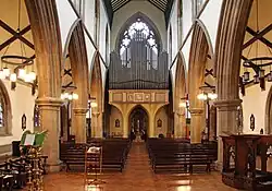 The building suffered from aerial bombing during the Second World War when all the interior surface decoration, stained glass and furniture was destroyed, as too the brick and stone vaulting of the chancel. The rebuilt church was reopened in 1954.[5] The architect was Nugent Cachemaille-Day (1896–1976).[6]