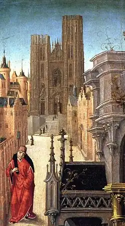 The two towers, built between 1470 and 1485, the upper parts of which are arranged in terraces, are attributed to Jan Van Ruysbroeck, the court architect of Philip the Good,[13] who also designed the tower of Brussels' Town Hall and the Collegiate Church of St. Peter and St. Guido in Anderlecht. They appear to be unfinished, lacking the spires seen in other Gothic cathedrals, and were originally meant to be much higher, in a style close to the Town Hall's tower or the north tower of the Cathedral of Our Lady in Antwerp. They nonetheless remain a prominent feature in the skyline of downtown Brussels.