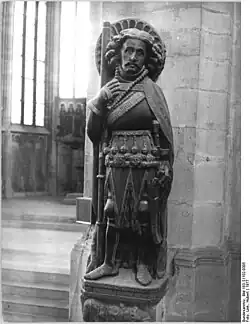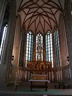 The church features notable art works, including stone sculptures by Conrad von Einbeck, who rendered the church's patron saint as Schellenmoritz (Bell Maurice) in 1411.[5][7] He created Schmerzensmann (Man of Sorrows) in 1416, Klagende Maria (Mourning Mary) in 1419, Christus an der Geißelsäule (Christ at the Column) in 1419, and a bust which is possibly a self-portrait, but more likely the portrait of one of the donors.[5][8] The late-Gothic high altar dates from 1511. The Renaissance pulpit was created by Master Zacharias Bogenkrantz in 1592, with a Schalldeckel added by Valentin Silbermann in 1604. The present organ was built by Sauer Orgelbau in 1925 and inaugurated by Thomaskantor Günther Ramin.[9]