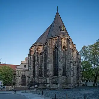 The church was built on the site of an earlier Romanesque church from 1388, dedicated to St. Maurice. The eastern part was built first, while the earlier church was still in place. The first builder was Conrad von Einbeck, followed by Hans Brochstete, Nickel Hoffmann and others. The church was consecrated in 1411.[1] The design planned a steeple in the west which was never built. The interior was completed by 1557.[2][3][4]