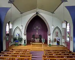Although Osgood lies near such heavily Catholic communities such as Minster and Fort Loramie,[2][3]: 8 its early settlers were predominantly Protestant.[4] Accordingly, the formation of a Catholic parish in Osgood came far later than the formation of parishes in nearby villages; St. Augustine's Church in Minster and St. Michael's Church in Fort Loramie were established by 1850,[3]: 2 but the foundations of a parish in Osgood were not laid until 1904,[4] and formal establishment of the parish came in 1906.[5] In its earliest years, the Mass was celebrated in common buildings; after worshipping for a time in a school, the parishioners purchased a barn for ecclesiastical purposes. For many years, the improvement of the parish's facilities was hindered by its size; the fewness of its members meant that money was frequently scarce.[4] Nevertheless, parishioners took significant steps in late 1906; their first temporary church was completed in September, and in this year they purchased a tract of land on the eastern side of the village. Construction of a permanent brick church soon began, and the finished church was dedicated on September 6, 1908 after costing $22,000. By 1914, membership had increased to eighty-five families from just thirty-five families in 1906.[5]